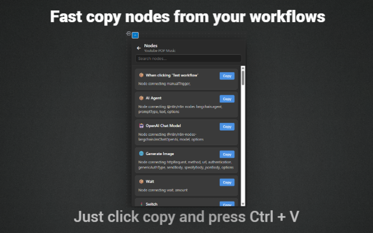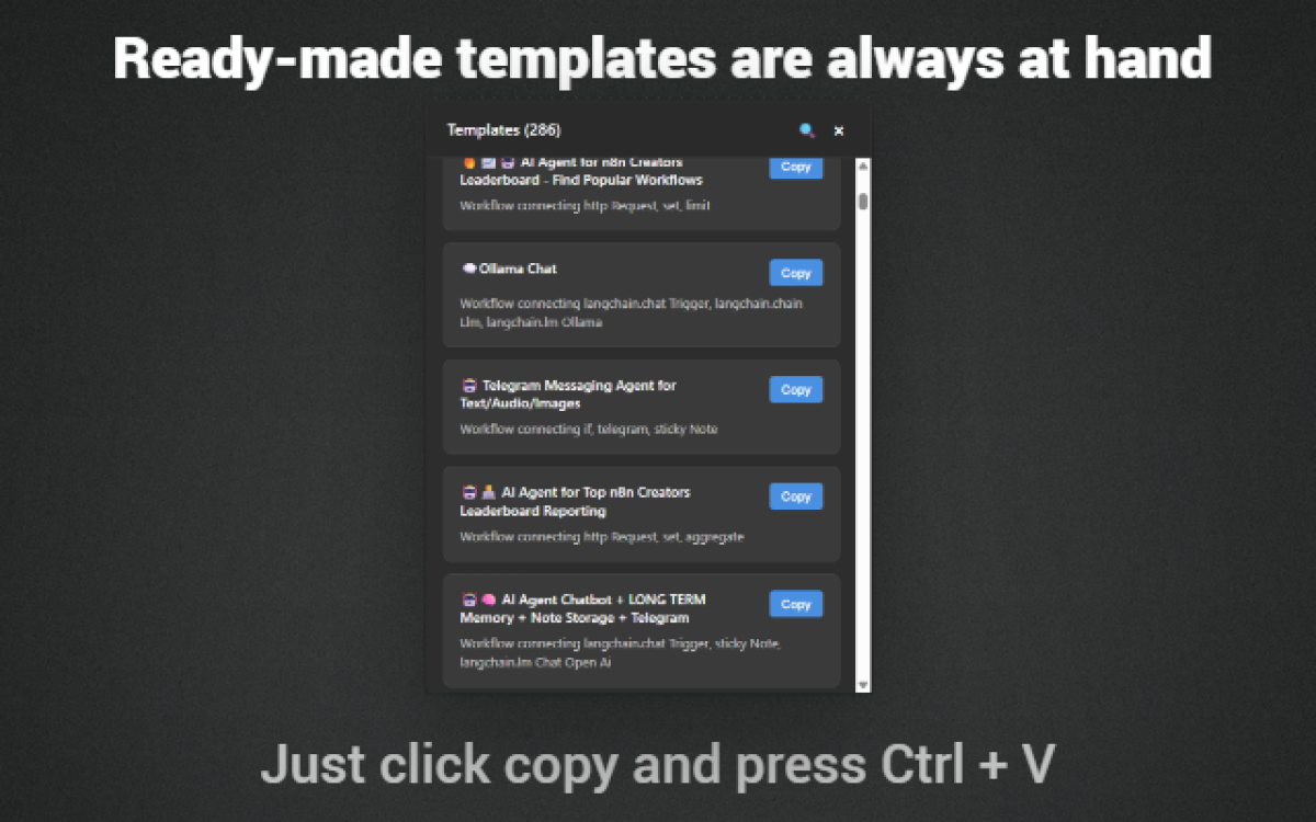 Show a menu with a list of templates to copy. Built-in more than 3500 workflows with the ability to preview!