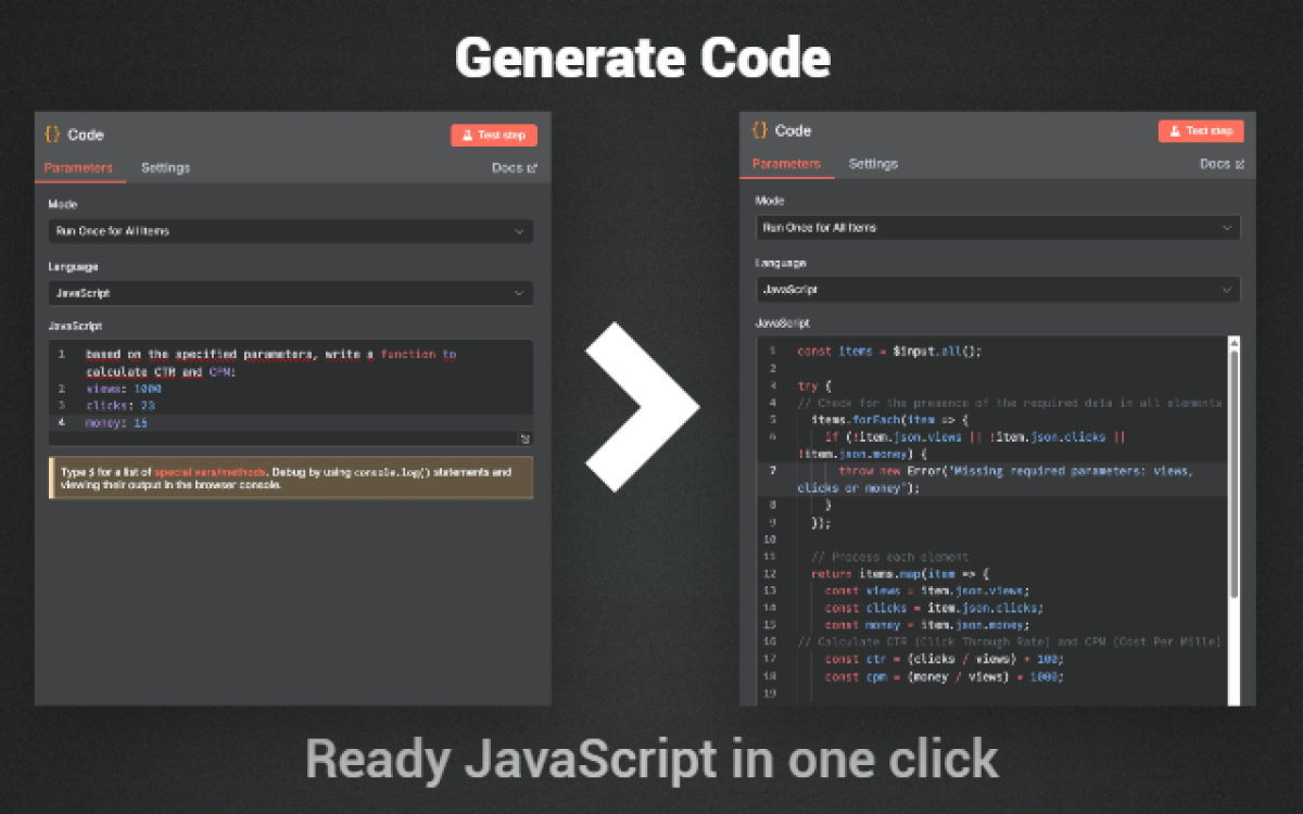 Type a description like "get the current date and format it as YYYY-MM-DD" and get the code inserted directly into the CODE node.