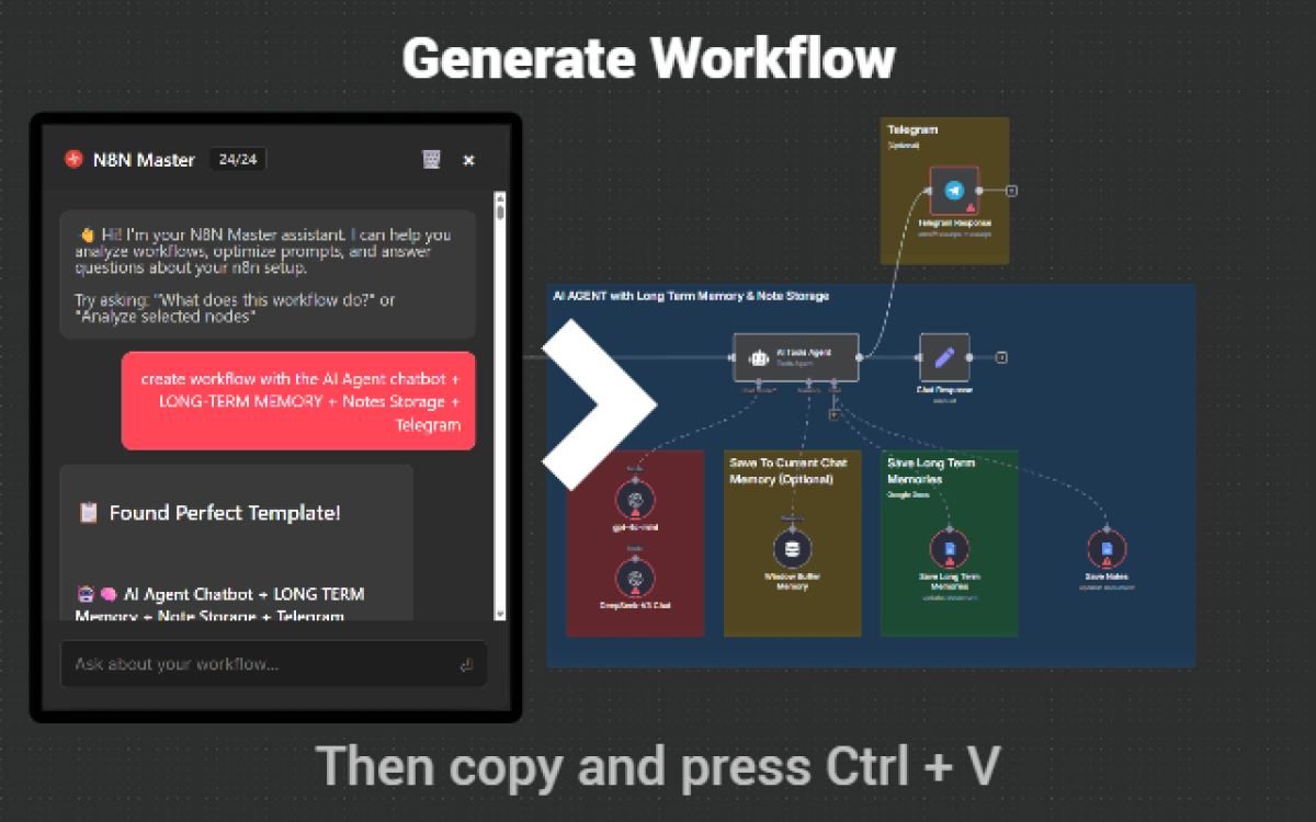 • "Generate workflow": Type a request like “create a Telegram bot with AI integration” and the agent will search existing templates or generate a new workflow for you.