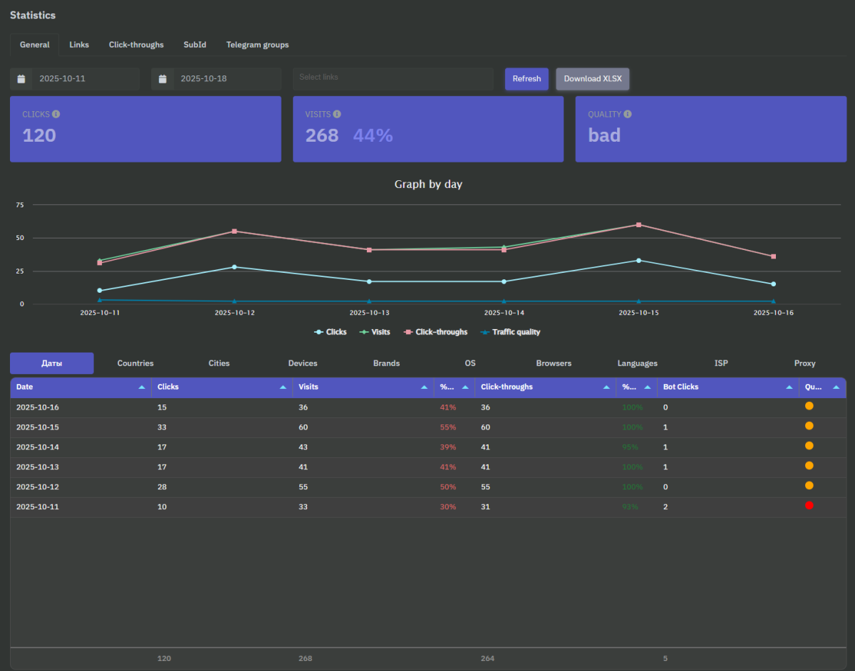 You can track statistics by day, country, city, device, mobile device brand, OS, browser, language, ISP, proxy used. Click statistics and detailed information on each click, starting from the source where the user clicked on your link.